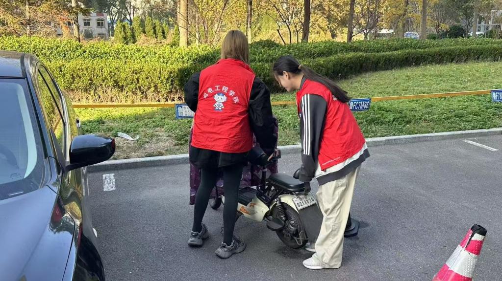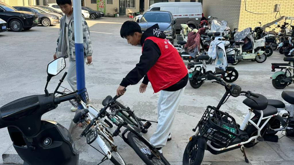 在本次志愿活动中,志愿者们兵分两路。其中一组负责摆放自行车、陪伴老人聊天、代购生活用品等。负责摆放自行车大的志愿者们把那些横七竖八的自行车扶正,一辆辆整齐排列,让原本杂乱的停车区域变得井然有序。