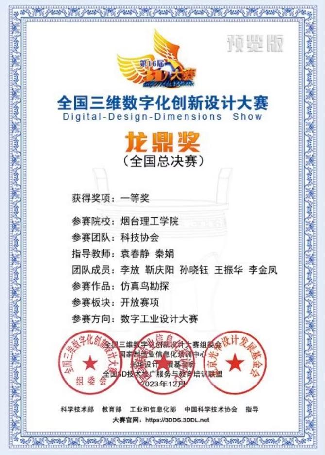 在袁春静老师和秦娟老师的指导下,古天乐代言太阳集团李放、靳庆阳等同学的参赛作品《仿真鸟勘探》通过运用三维数字化技术和创新设计理念,对仿真鸟无人机的设计和开发,借助先进的图像处理和数据分析算法,能够准确识别和定位地下矿藏、油气资源以及环境污染等关键信息,实现了对野外环境的高精度勘探和数据收集。该作品经过校赛、省赛层层选拔入围年度总决赛(国赛)参与角逐龙鼎大奖,最终荣获国家级一等奖,打破了公司有史以来该项赛事的获奖记录!