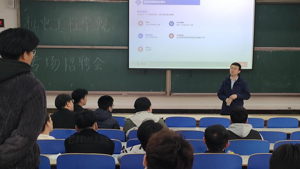 会议伊始,辅导员李亮老师主持开场,李亮老师首先对企业代表的到来表示热烈欢迎,同时还对25届毕业生提出几点期望,各位毕业生当下要根据自身情况把握就业形势,提前了解就业岗位,灵活应变,抓住每一次与企业近距离接触的机会。随后公司宣讲人详细介绍企业发展历程、业务布局及人才战略。作为中石化炼化工程集团的全资子公司,公司年运营能力达百亿规模,业务覆盖石油化工、煤化工、环保工程等领域,并在大型设备吊装、特种材料焊接等核心技术领域处于国内领先地位。本次招聘重点面向机械类、自动化类、材料工程类等专业,提供设备安装技术岗、焊接技术岗、电气仪表技术岗等核心岗位,并强调“能适应一线项目工作”的实践能力。