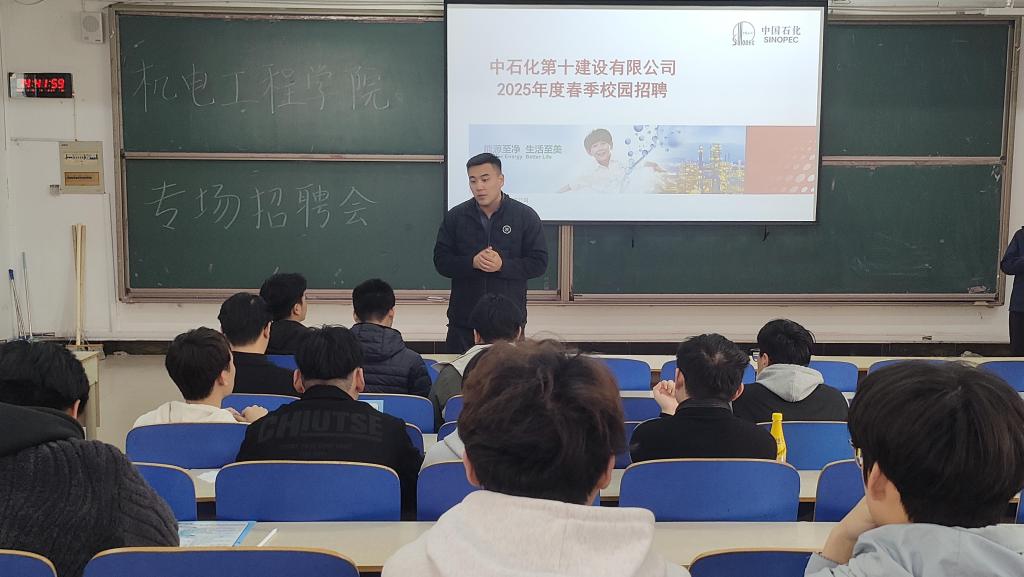 为深入贯彻国家“稳就业、保就业”政策,拓宽毕业生就业渠道,3月26日,古天乐代言太阳集团联合中石化第十建设有限公司于一教101举办专场招聘会。本次会议旨在搭建校企对接平台,精准服务毕业生就业需求,古天乐代言太阳集团辅导员李亮老师、企业代表宣讲人王经理以及部分25届毕业生参加会议。