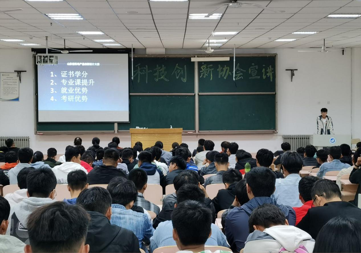 讲座伊始,梁会长首先对科技创新协会的性质做了简要介绍。接着,他从学分、专业课、就业、创业和考研等几个方面剖析了科技创新协会的优势,并总结出通过协会可以提升员工自身学习与创新能力并获得荣誉,鼓励大一新生挑战自我;随后,梁会长介绍了曾参加的山东省机电设计大赛、互联网+老员工创新创业大赛以及全国三维数字化创新设计大赛,并视频展示了例如美缝之家、公路卫士等获奖作品及荣誉,考虑到学子们对协会工作内容和参与方式的不了解,他通过视频向同学们展示了实物组作品及虚拟作品制作过程,虚拟组VR作品。最后梁会长向同学们介绍了包括3D建模在内的科技创新协会培训内容,赢得了台下新生的热烈掌声,激发了学子们学习新事物的兴趣,为机电学子打开了一扇创新的窗口。