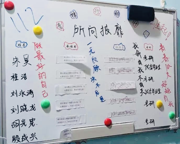 青桔行动计划具体活动内容:宿舍内置办每位宿舍成员的大学目标和计划排期表(可使用泡沫板或小黑板)。机电系20级员工通过此活动,确立了自己的大学目标和生涯规划,拥有了确立目标的上进意识。展现了员工们积极向上的精神风貌和多元的宿舍文化。机电工程系各指导老师对各宿舍青桔活动计划成果进行了指导和点评,使同学们确立更好目标追求更好未来!