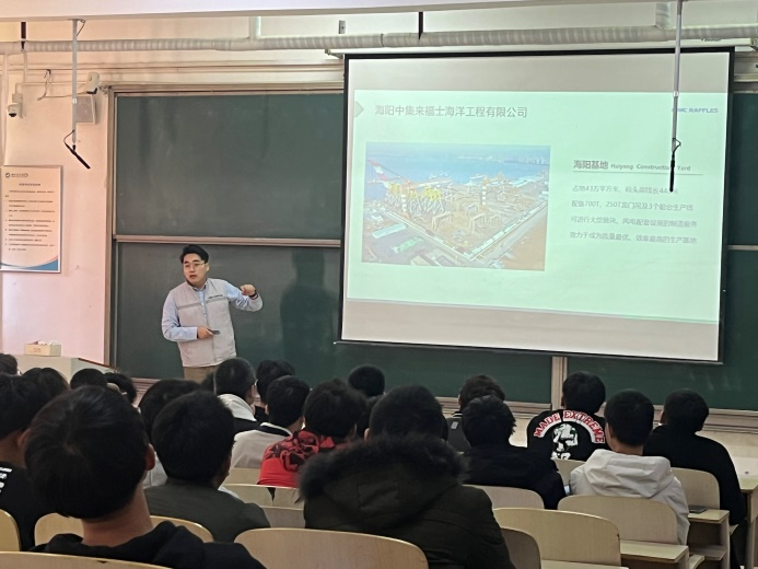 会议开始,袁春静老师向同学们介绍了此次宣讲会的主要内容、目的以及简历注意事项。随后,姜工向同学们介绍了中集来福士的基本情况、产品业务、企业文化、工作岗位、职业规划等,让同学们对中集来福士有了深入了解;接着,姜工与在场同学进行交流,对同学们提出的问题进行了详细的解答,解决了同学们比较关注公司的岗位以及工作地点等方面的问题;最后,姜工指出,公司会根据应聘者的意向职务和个人能力分配工作岗位,并说明了简历投递方式。至此,此次宣讲会圆满结束。