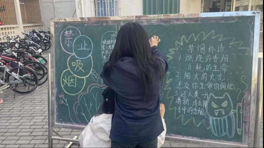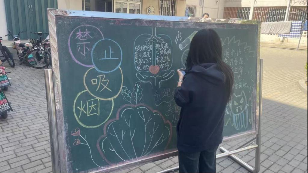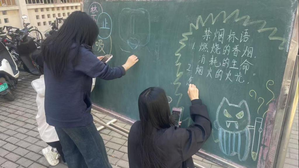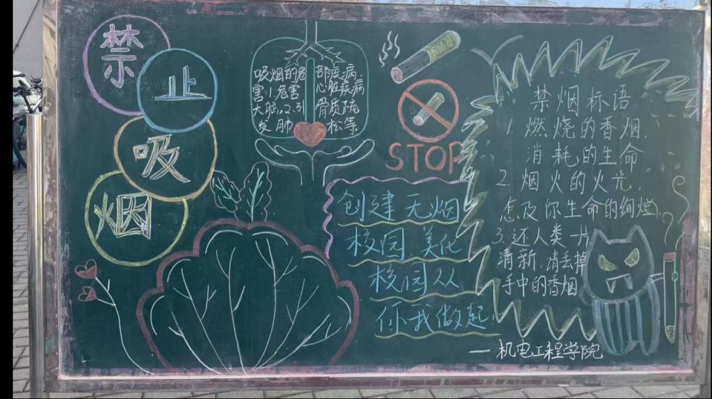 活动期间,活动中,各班级踊跃参与,精心设计黑板报。6 号楼宿舍区宣传栏前的作品尤为突出,它用醒目的警示标语,像 “燃烧的香烟,消耗的生命”,搭配形象插画,把吸烟危害展现得淋漓尽致,路过的师生纷纷被吸引。这些黑板报让大家在欣赏创意的同时,也加深了对烟草危害的认识。