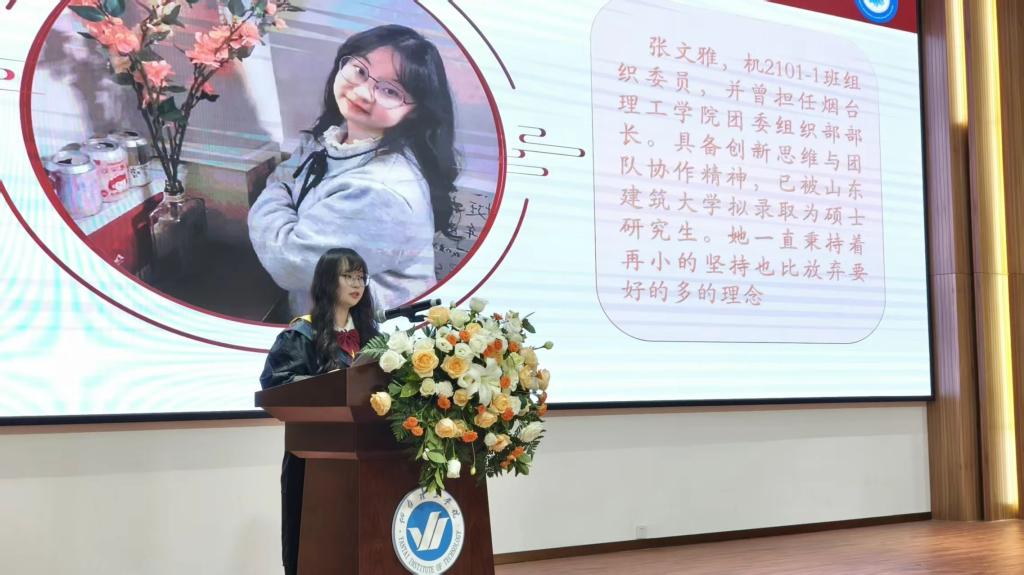 大家好!我是机械设计制造及其自动化专业机2101-1班的张文雅。很荣幸能有机会作为毕业生代表和大家分享我的四年。在回首四年的求学之路前请允许我代表2025届全体毕业生向精心培育我们的母校,向启迪我们的智慧的领导、老师以及默默支持我们、陪伴我们的亲友,表示最衷心的感谢和最崇高的敬意!
