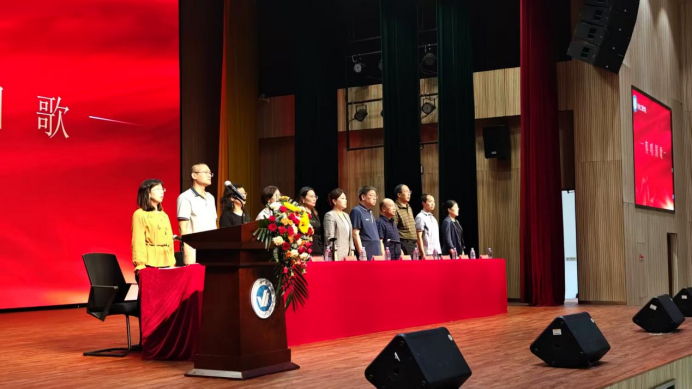 在激昂雄壮的国歌声中,鲜艳的五星红旗冉冉升起,全场师生齐唱国歌。
