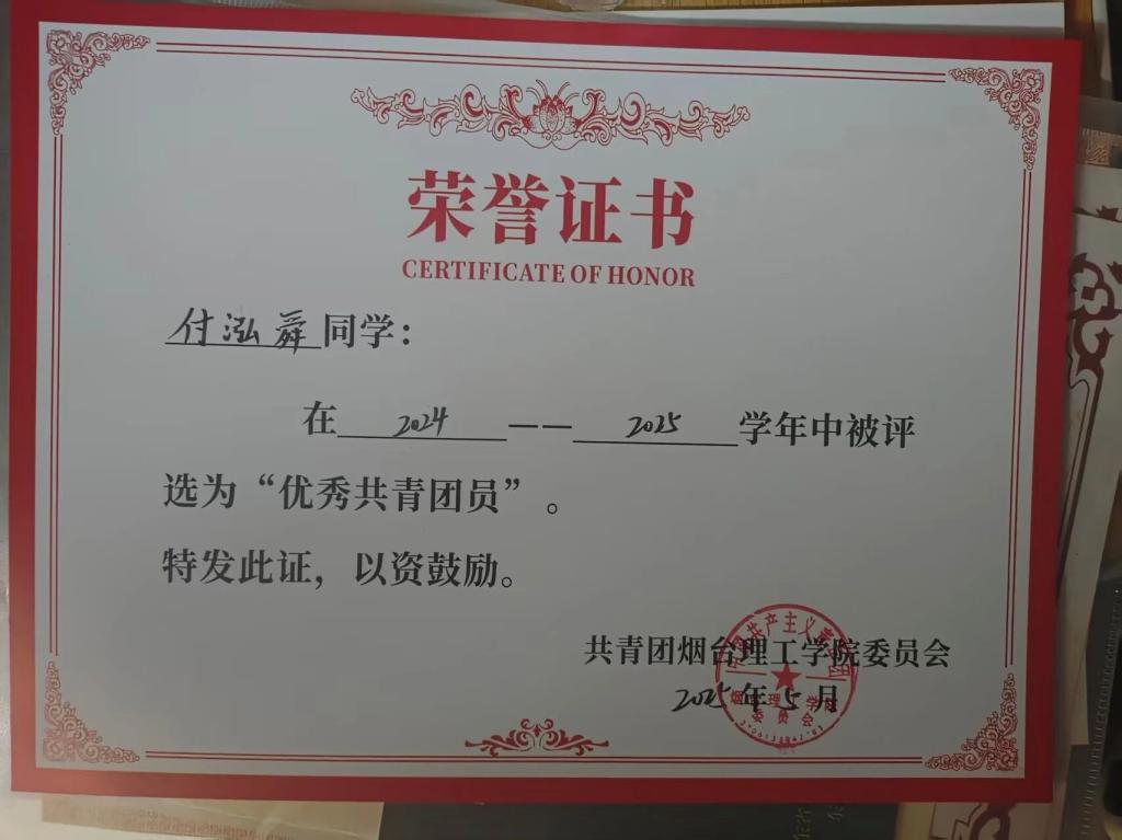 付泓舜以勤学笃行、精进不怠的姿态,深耕专业领域,始终秉持 “自强、博识、求新、致道” 的校训,践行自主学习理念。他明确学习核心方向,课堂专注钻研、课后勤学好问,主动与师生交流探讨、取长补短,在专业知识积累与技能锤炼中稳步前行。入学至今,他连续两年综合测评成绩稳居专业第一,平均学分绩点(GPA)达 4.04,获评 2023-2024 学年、2024-2025 学年山东省政府奖学金。
