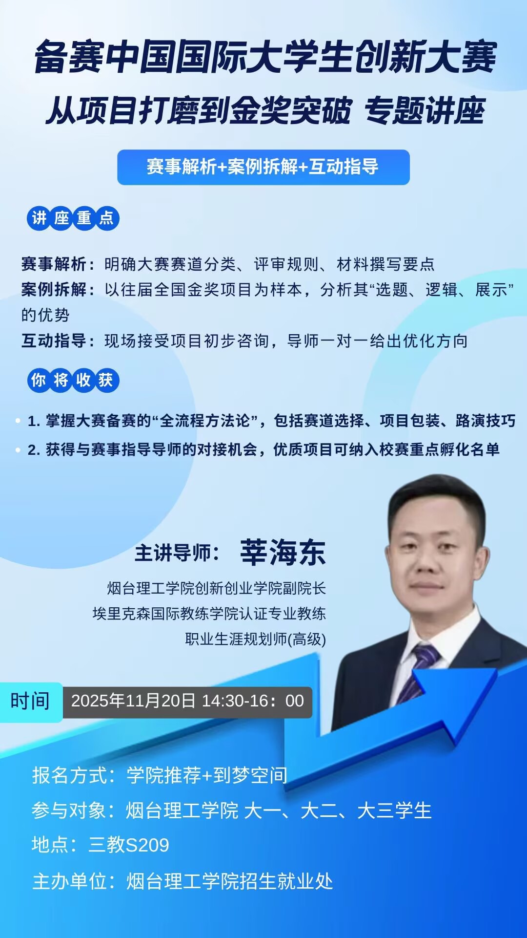 内容要点: 赛事规则解析、金奖案例拆解、现场项目指导(优质项目可纳入校赛孵化)