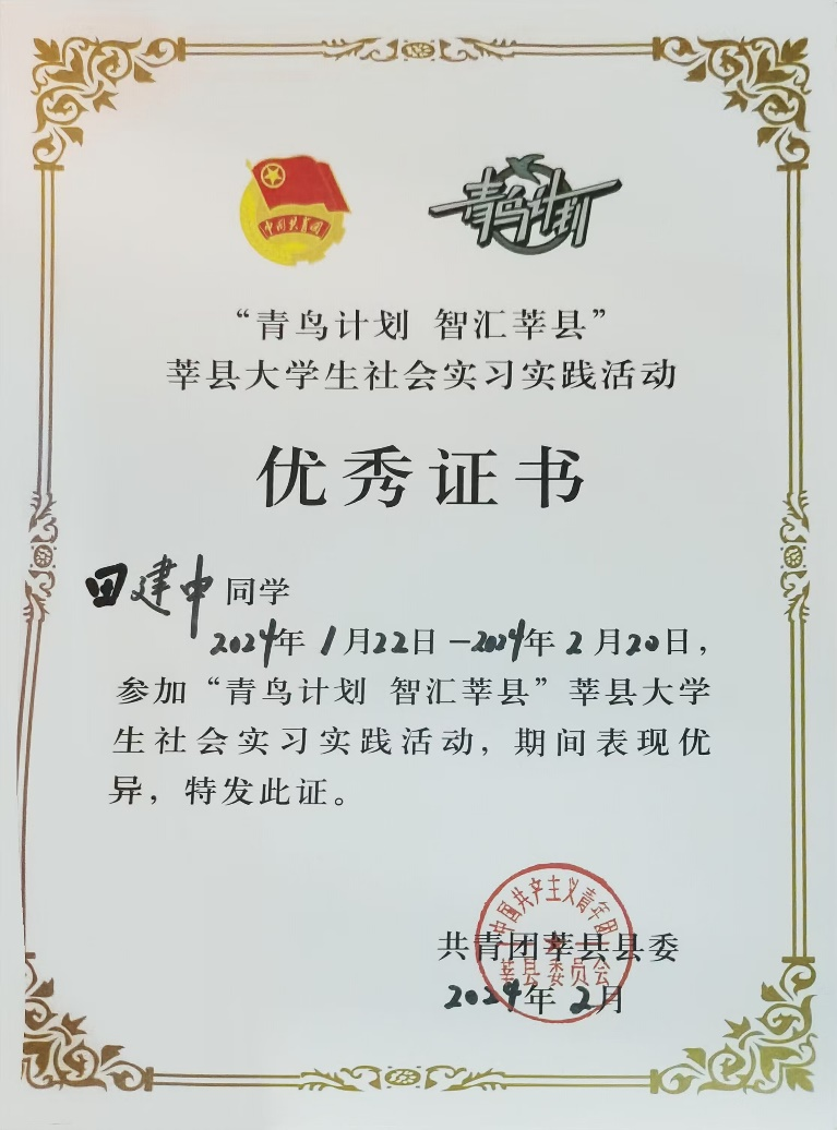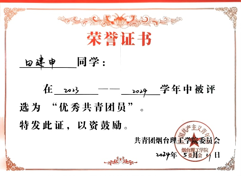 田建申作为一名共青团员,思想上积极向党组织靠拢,积极参加党团活动,在大一学年被评为入党积极分子,在五四评优活动中,荣获校级优秀团员称号,始终不忘初心,紧跟党的思想。在寒假期间,他积极参加“青鸟计划”、“返家乡”等社会实践活动,在实践中,提高了与人沟通,团队协作能力,并在社会实践中荣获优秀社会实践个人等荣誉称号。